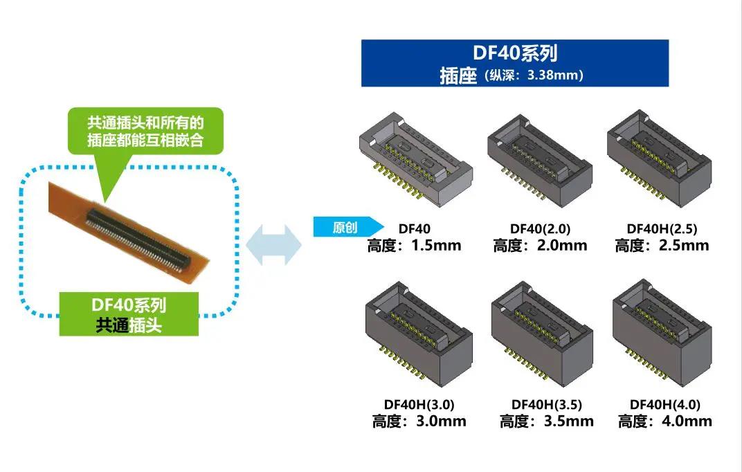 特點 1. 省空間:縱深3.38mm 2. 堆疊高度 1.5-4.0mm 3. 對應USB4 Gen.2(10Gbps)信號傳輸 *1 4. 有效嵌合長度長:0.45mm 5. 卓越的端子構造實現(xiàn)了明確的鎖扣手感以及大嵌合力 6. 防止端子變形構造 7. 種類繁多(帶護罩:DF40G系列,帶完全鎖:DF40GL系列,ADAS:DF40T系列) 8.核心數(shù)量從10到120核心變化巨大 9.用導向肋確保自動對準:0.33mm 10.防止鎳阻擋層焊接的結(jié)構 11.還提供用于生產(chǎn)線檢查的高度耐用的連接器* 只有H=1.5 mm的產(chǎn)品支持Type-C DF40系列變體