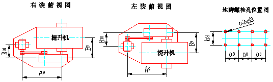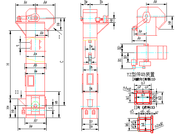* :表中料斗容積為料斗盛水時容積。于實際填充量相近,故輸送量計算時未考慮填充系數(shù),具體選型時應(yīng)根據(jù)物料特性查表(3)求得ψ修正值以此值修正表給輸送量。 二 、提升機(jī)的結(jié)構(gòu)型式圖如下、主要尺寸參數(shù)見表2、傳動裝置技術(shù)規(guī)范見表3. |