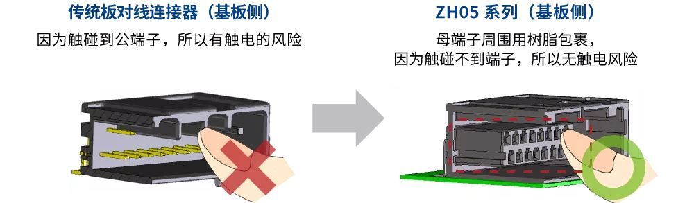 隨著電池生產數(shù)量的增加對安全性的要求 一般監(jiān)控車載電池電壓等連接到帶電部位時,使用棒狀突出的公端子作為基板端的連接器。但是,現(xiàn)有的連接器端子形狀會產生異物附在相鄰端子之間,從而產生短路的風險。而且工作人員在進行插拔作業(yè)時接觸到端子會有觸電的風險。在世界范圍內,隨著向混合動力車和EV(電動汽車)轉移的趨勢,電池的生產數(shù)量不斷增加,這也意味著風險的增加,那么安全對策就成為了當務之急。 創(chuàng)造性的結構,確保高安全性 為了滿足這樣的需求,“ZH05”在追求車載品質和防止觸電這兩點上進行了開發(fā)。板對線連接器采用箱型的公端子,用樹脂將端子周圍物理性包圍使之絕緣,并實現(xiàn)了即便有異物進入也不會造成短路,工作人員不會觸摸到端子的革新化的防觸電結構。另外,采用了公端子獨有的雙彈簧結構,確保了適合車載內部連接使用的耐熱性及耐振動性,從而完成了高可靠性的連接器。并且,由于在電池方面,電池的容量很重要,所以也追求其小型化,這就是“ZH05”。 防觸電車載用板對線連接器“ZH05” (1) 基板端連接器的公端子周圍用樹脂包圍的防觸電構造。