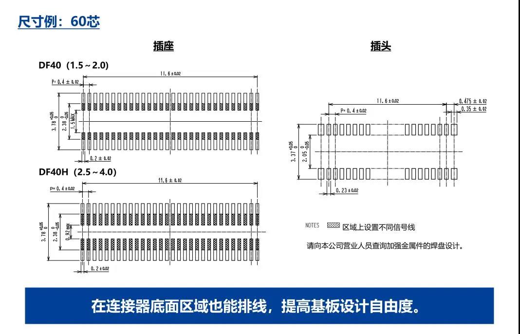 特點 1. 省空間:縱深3.38mm 2. 堆疊高度 1.5-4.0mm 3. 對應USB4 Gen.2(10Gbps)信號傳輸 *1 4. 有效嵌合長度長:0.45mm 5. 卓越的端子構造實現(xiàn)了明確的鎖扣手感以及大嵌合力 6. 防止端子變形構造 7. 種類繁多(帶護罩:DF40G系列,帶完全鎖:DF40GL系列,ADAS:DF40T系列) 8.核心數(shù)量從10到120核心變化巨大 9.用導向肋確保自動對準:0.33mm 10.防止鎳阻擋層焊接的結(jié)構 11.還提供用于生產(chǎn)線檢查的高度耐用的連接器* 只有H=1.5 mm的產(chǎn)品支持Type-C DF40系列變體