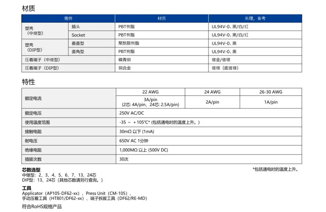 特點(diǎn) [SignalBee?] 2 x 2.2 mm間距 用于狹小空間纖細(xì)型中繼連接器(UL C-UL認(rèn)證產(chǎn)品) 1. 纖細(xì)光滑的外形適合狹窄空間的布線 2. 清晰的鎖扣感和目視可確認(rèn)是否鎖定 3. 可靠的接觸結(jié)構(gòu) 4. 堅(jiān)固的端子結(jié)構(gòu) 5. 芯數(shù)選型:2、3、4、5、6、7、13、24 DF62B:標(biāo)準(zhǔn)型 DF62C:鎖加部保護(hù)強(qiáng)化型 DF62P:面板安裝型 6. 可與DF11/DF59系列共用自動(dòng)壓著設(shè)備 7. 防冷凝措施(防水型DF62W) 細(xì)小